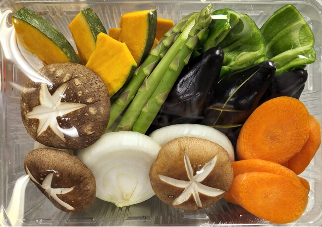 1910年創業の老舗青果店。ナス、人参、タマネギ、カボチャ、ピーマン、椎茸などのセットを販売します。新鮮な野菜の盛合わせをカットしてご提供します。