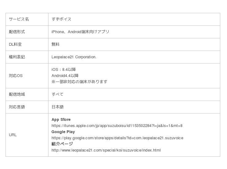 「すずボイス」は、レオパレス21のCMキャラクターである広瀬すずさんによる、日常のさまざまなシーンでお使いいただけるボイスメッセージを収録した、iOS/Android向けスマートフォンアプリです。「おはよう!」や「おやすみ!」など朝晩の挨拶はもちろん、「さっすがぁ!」や「元気だしてね」など、励まし褒めてくれる充実した内容になっており、11種類の壁紙とともにアラーム設定が出来るほか、いつでもどこでも10種類のボイスメッセージを再生する事ができます。また、この「すずボイス」は、広瀬すずさん初の公式ボイスアプリです。