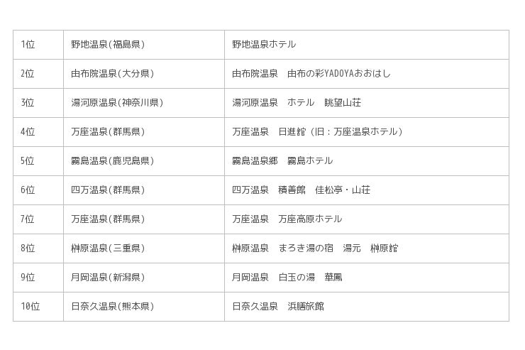 2015年 年間人気温泉宿ランキング(※1)TOP10