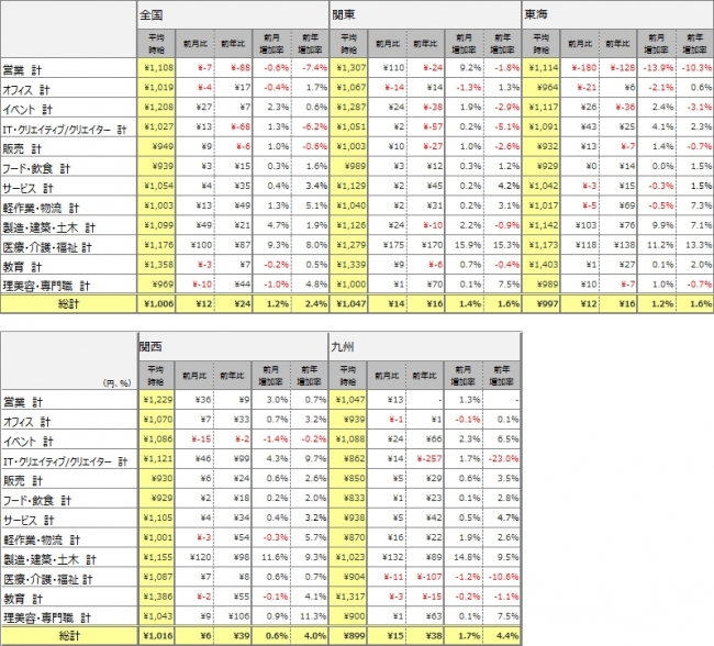 関東エリアの平均時給は1,047円(前月比14円増、前年比16円増)となり3ヶ月ぶりに前月を上回りました。東海エリアの平均時給は997円(前月比12円増、前年比16円増)となり2ヶ月ぶりに前月を上回りました。関西エリアの平均時給は1,016円(前月比6円増、前年比39円増)となり、5ヶ月連続で前月を上回りました。九州エリアの平均時給は899円(前月比15円増、前年比38円増)となり、3ヶ月ぶりに前月を上回りました。