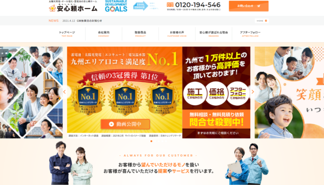 株式会社安心頼ホームが「九州エリアの太陽光発電 販売施工会社 口コミ満足度」など3項目で第1位を獲得!