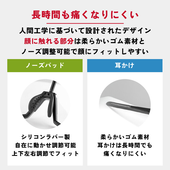 軽量で顔に触れる箇所は柔らかい素材になっているので長時間の装着も痛くなりにくい。