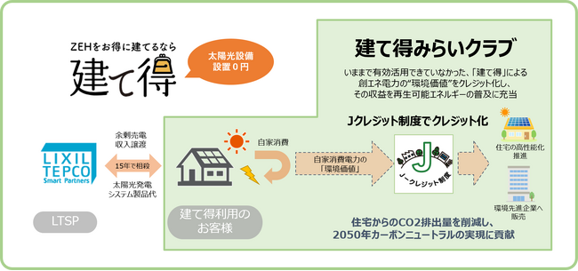 この度開始する「建て得みらいクラブ」は、建て得サービスをご利用いただいたお客さまを対象に、サービスを通じて太陽光発電システムにて発電した電気のうち、ご家庭でご利用いただいている自家消費電力のデータをLTSPが取得し、環境価値としてJ-クレジット制度を活用してクレジット化する仕組みです。クレジット化した環境価値はLIXIL内での活用および、環境先進企業などへ販売等を行います。販売した場合その収益は、カーボンニュートラル実現に向けた住宅の高性能化推進の活動費に充当することで、環境価値を社会に還元します。