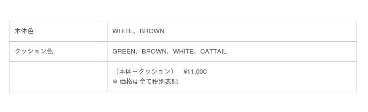 本体はWHITEとBROWNの2色、またクッションはGREEN、BROWN、WHITE、CATTAILの4種類からお選び頂けます。