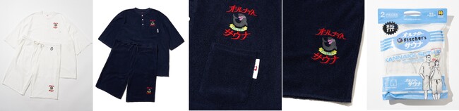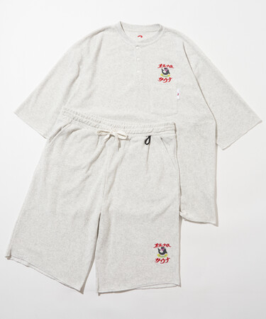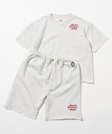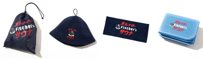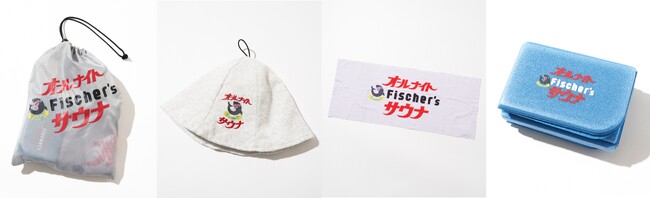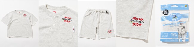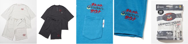 展開されるアイテムは、フィッシャーズのアイコンがトップスの胸とショーツの裾に記されたスペシャル館内着(パイル・裏毛2素材展開)と、サウナハット・タオル・マットがセットになったサウナセット!