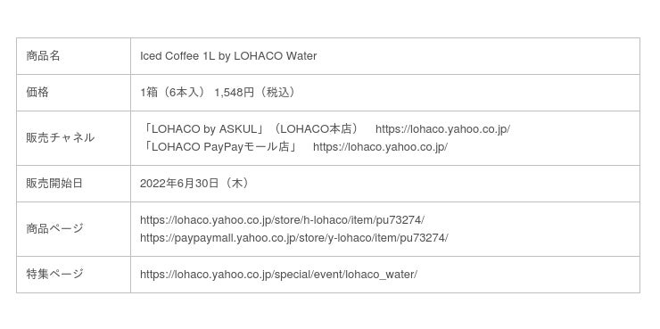 アスクル株式会社(本社:東京都江東区、代表取締役社長:吉岡晃、以下「アスクル」)が運営する一般消費者向け(BtoC)インターネット通販サービス「LOHACO」(ロハコ、以下「LOHACO」)は本日6月30日より、オリジナル天然水LOHACO Waterで抽出したアイスコーヒー「Iced Coffee 1L by LOHACO Water」(1箱6本入)を販売します。