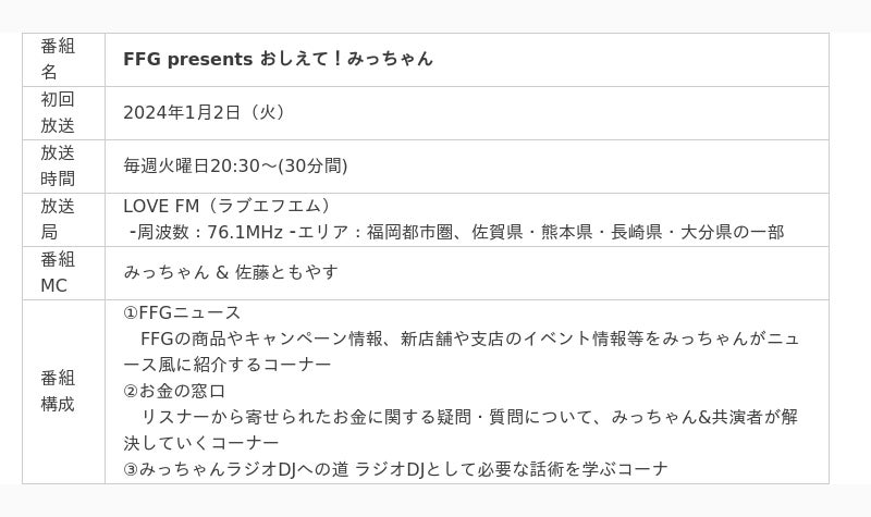 株式会社ふくおかフィナンシャルグループ(取締役社長 五島 久、以下FFG)は、2024年1月2日からLOVE FMで新番組「FFG presents おしえて!みっちゃん」を開始します。