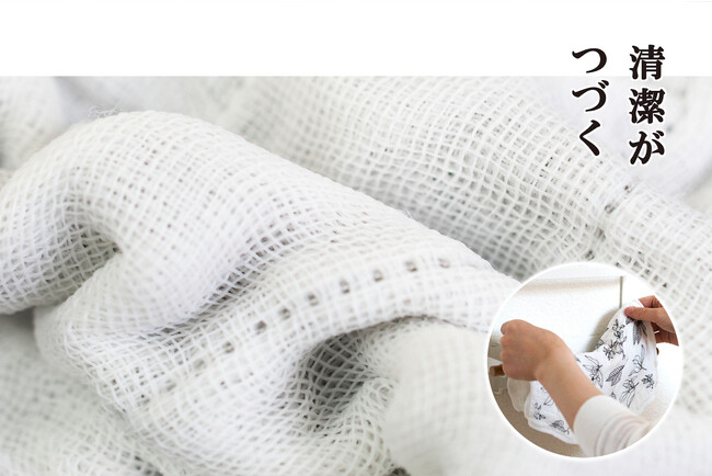 奈良県の特産品、蚊帳生地は目が粗くて通気性がよく、雑菌の繁殖を抑制。