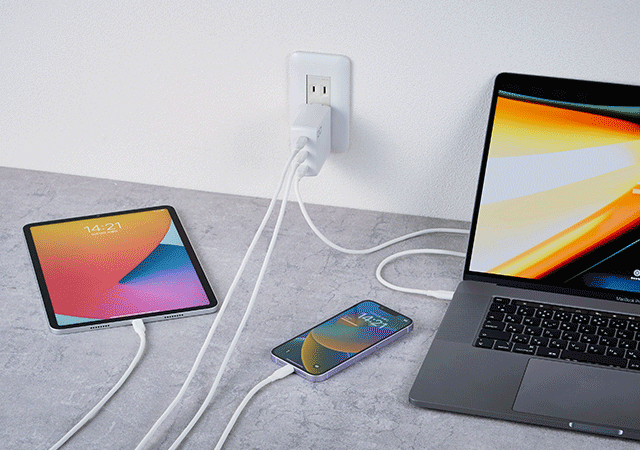 最大140Wを各ポートへフレキシブルに割り振るので、ハイスペックなノートPCやスマホ、ゲーム機など様々なデバイスをこれ1台で最適速度で充電可能です。