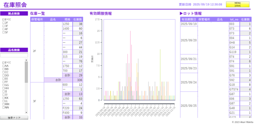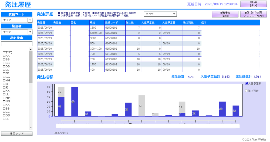 部材の「在庫照会」と「発注履歴」画面を開発、在庫照会画面で有効期限の近いロット情報を表示し現場での先入れ、先出し判断を促し、発注履歴画面で発注情報や納期回答日、発注残数などを一覧で確認することで過剰発注を防止し、過剰在庫を60%削減しました。