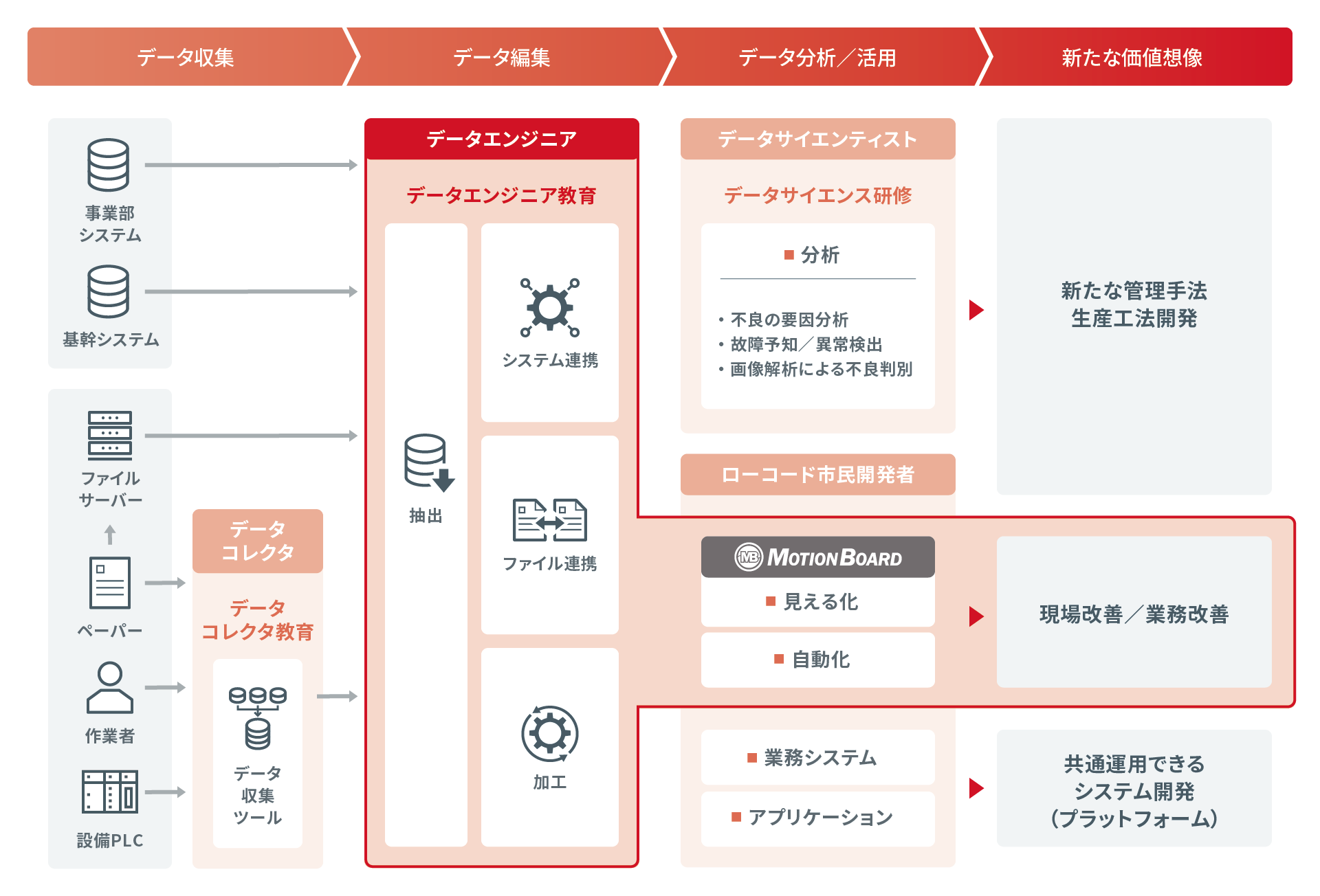 データエンジニア教育の概要と範囲。MotionBoardはデータ分析/活用フェーズで見える化に活用