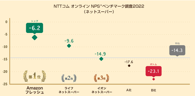 NTTコム オンライン・マーケティング・ソリューション株式会社(本社:東京都品川区、代表取締役社長:塚本 良江、以下NTTコム オンライン)は、ネットスーパー業界を対象に、NPSベンチマーク調査2022ネットスーパー部門を実施しました。この結果、最もNPSが高いのは、Amazonフレッシュとなりました。