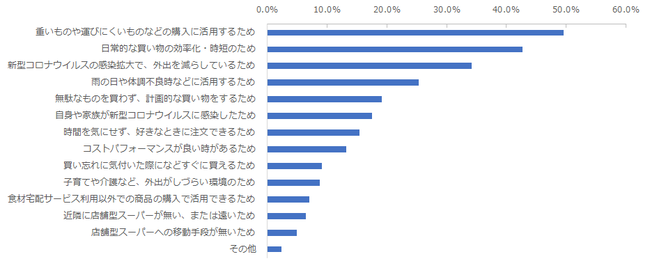 対象のネットスーパーを利用する目的について調査したところ、「重いものや運びにくいものなどの購入に活用するため」が49.7%と最も高くなりました。次いで「日常的な買い物の効率化・時短のため」(42.7%)、「新型コロナウイルスの感染拡大で、外出を減らしているため」(34.2%)、「雨の日や体調不良時などに活用するため」(25.3%)といった理由が続きました。