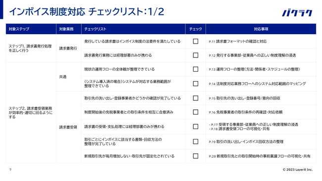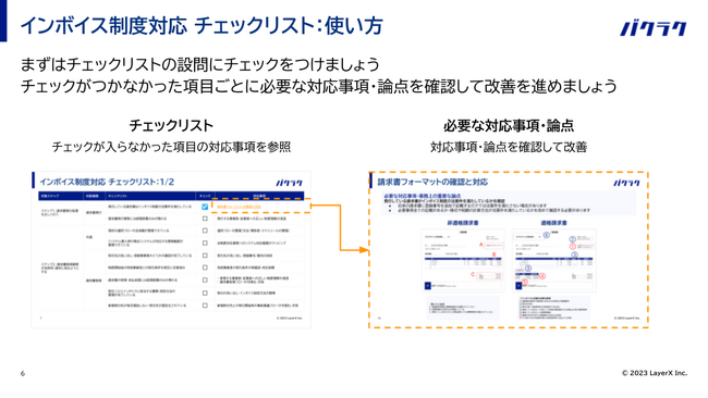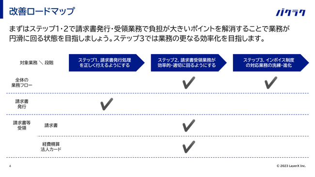 すべての経済活動のデジタル化を目指す株式会社LayerXは、法人支出管理サービス「バクラク」において、2023年10月1日に始まったインボイス制度(適格請求書等保存方式)に対して、「インボイス制度対応の負担を減らすためのチェックリスト・改善ロードマップ」を公開しました。