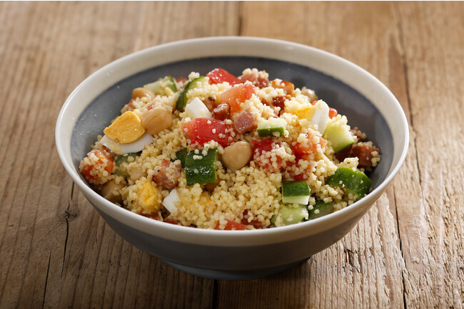 デュラム小麦の粗挽粉から作られるモロッコ発祥の世界最小のパスタ「クスクス」に、ガルバンゾ(ひよこ豆)・トマト・きゅうり・レッドオニオン・ベーコン・ゆで卵を加え、ビネガー風味に仕上げた、ほんのりミントが香るサラダです。