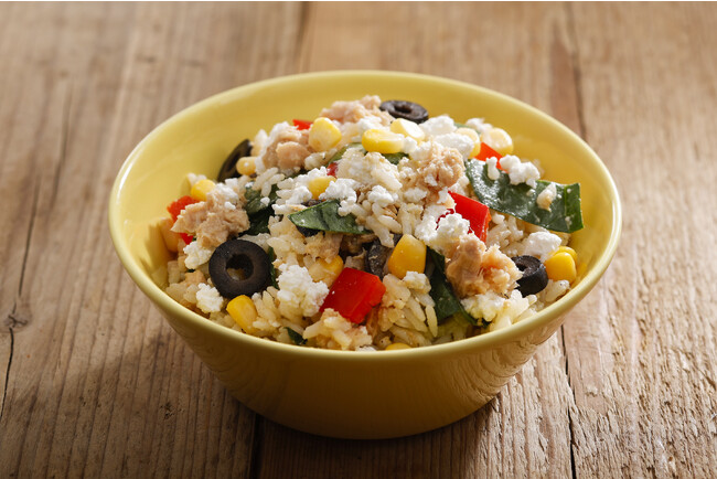 「カルローズ米」にカッテージチーズ・ツナ・ほうれん草・コーンを加え、アンチョビ風味のドレッシングで仕上げたライスサラダです。