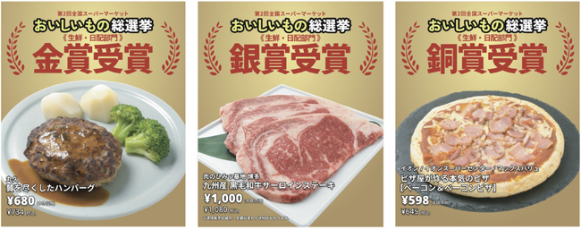 2023年5月1日(月)〜24日(水)の期間で集まった一般生活者からの投票件数は、昨年の約3倍となる126,313票*にのぼりました。その結果、4部門の金賞には、【デリカ部門】セイミヤの「三元豚のとんかつ」、【スイーツ部門】ベイシアの「別海のおいしい牛乳使用 くりーむマフィン」、【グロサリー部門】週末びっくり市の「ガリスパ!(ガーリックスパイス)」、【 生鮮・日配部門】丸久の「贅を尽くしたハンバーグ」が輝きました。