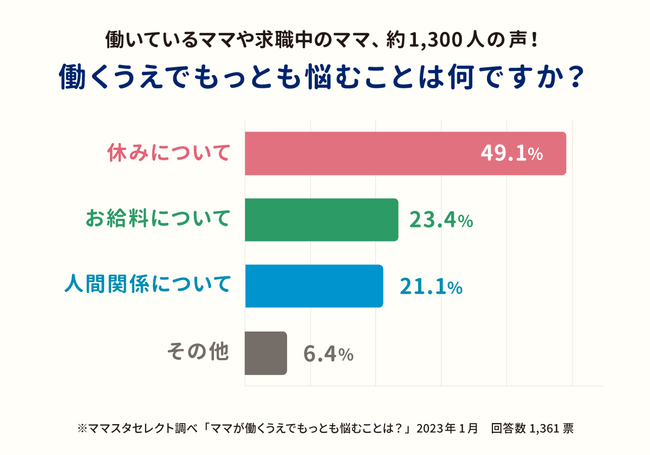 今回ママスタセレクトに寄せられた回答数は1,361票。もっとも多かったのは「臨機応変に休みがとれないなど、休みに関して」。半数近くのママたちが悩んでいました。次いで、「お給料に関して」、「同僚や上司との人間関係」と答えたママはともに約20%。「その他」は約6%という結果です。
