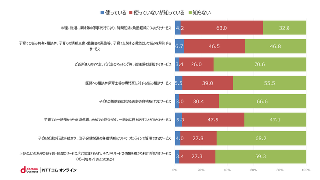 また、利用状況については、「子育ての悩み共有・相談や、子育ての情報交換・勉強会の実施など、子育てに関する漠然とした悩みを解決するサービス」が6.7%で最も高く、次いで「医師への相談や保育士等の専門家に対する悩み相談サービス」「子育ての一時預かりや病児保育、地域での見守り等、一時的に目を話すことができるサービス」など、悩み相談や一時預かりのサービスの利用割合が比較的高いことがわかった。(図2)