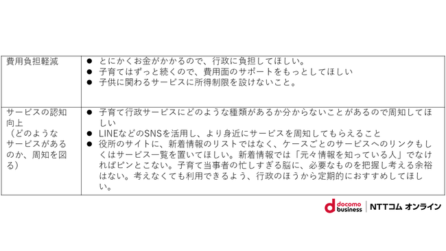 また、「その他、子育て関連サービスに関する要望や行政に期待すること」では、費用負担軽減を求める意見が多数を占め、費用負担がサービス利用の大きな阻害要因の1つとなっていることが伺えた。加えて、サービス認知向上に関する意見として、デジタル活用の有効性も確認できた。(表1)