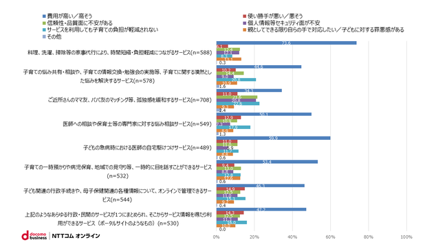 子育て関連サービスを「使ってみたいと思わない」理由について調査したところ、「費用が高い/高そう」といった回答が全サービスにおいて突出して高い割合を占めた。(図4)