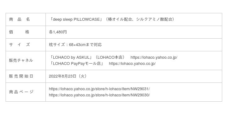 アスクル株式会社(本社:東京都江東区、代表取締役社長:吉岡晃、以下「アスクル」)が運営する一般消費者向け(BtoC)インターネット通販サービス「LOHACO」(ロハコ、以下「LOHACO」)は、老舗寝具メーカーの西川株式会社(本社:東京都中央区、代表取締役社長:西川八一行、以下「西川」)と共創し本日8月23日より、睡眠課題とお客様の枕に対する悩み解決を目指し開発した枕「deep sleep PILLOW」2種(仰向け寝、横向き寝)を販売します。