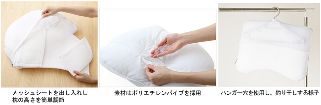 さらに、枕を吊り干ししやすいよう上部にはハンガー穴付きで、お手持ちのハンガーを活用いただくことが可能です。いつでも気軽に洗濯できるため、汗をたくさんかく今の季節はもちろん、1年中清潔感をキープでき心地良い睡眠環境をサポート。「干し方が良くわからないから洗えない」という課題を抱えているお客様の声にお応えします。