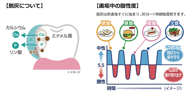 むし歯の原因菌であるミュータンス菌が飲食による炭水化物や糖類を分解して酸を作り出し、その酸によって歯が溶かされ、歯のエナメル質の成分であるカルシウムなどのミネラル成分が溶け出します。これを脱灰といい、飲食後すぐに始まり、30分〜1時間程度続きます。そこで、今回発売した『モンダミン リセットコートプロ』で、効果的な口腔内のセルフケアに繋げてはいかがでしょうか。