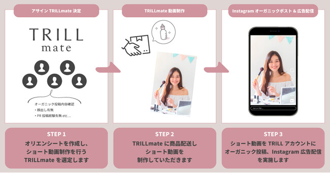 「TRILLmateショート動画制作×SNSブーストメニュー」は、TRILLが運営するインフルエンサー組織「TRILL mate」の動画クリエイターに、ショート動画を作成していただき、その動画を用いて広告配信を実施するメニューです。