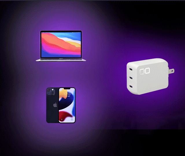 『NovaPort TRIO 65W』はUSB-Cポートを3つ備えており、3ポート同時充電時はデバイスにより、20W+20W+20Wまたは30W+30W+5Wの電力配分を採用。iPhoneの3台同時急速充電はもちろんのこと、PC+タブレット+小型デバイスなどの同時充電時も、効率の良い電力配分となるよう設計しました。