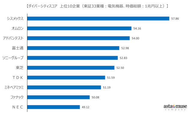 アスタミューゼ株式会社(本社:東京都千代田区、代表取締役社長 永井歩)は、2022年12月に人的資本可視化スコアを活用した「人的資本可視化支援サービス」の提供を開始しました。今回は電気機器業界におけるダイバーシティスコアランキングをご紹介します。
