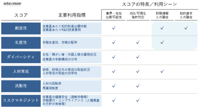 アスタミューゼ株式会社では、企業価値向上につながる人的資本可視化を実現するため、投資家が評価する上で重要な「企業価値との関係性」と「比較可能性」に注目した「人的資本可視化スコア」を開発しました。同スコアは複数の切り口で算出しています。