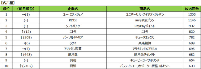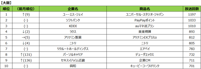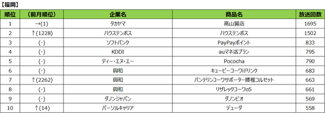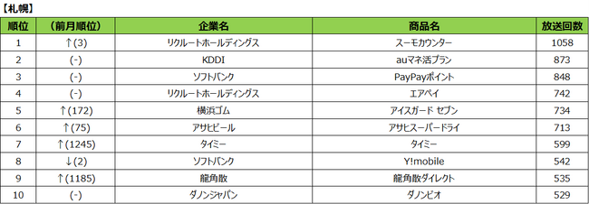 KDDI「auマネ活プラン」およびソフトバンク「PayPayポイント」は、東京地区・大阪地区・名古屋地区・福岡地区・札幌地区のすべてで上位4位以内にランクインしました。どちらのCMも、全国的な大量出稿となっていたことが見て取れます。また、札幌地区5位には横浜ゴム「アイスガード セブン」といった冬用タイヤがランクインしており、一足早い冬の訪れを感じさせる結果となりました。