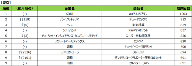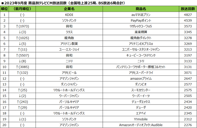 2023年9月度テレビCM放送回数ランキング発表〜携帯キャリアが提供する、資産形成を意識した料金プランのCMが全国で上位に〜