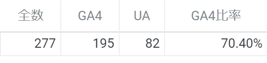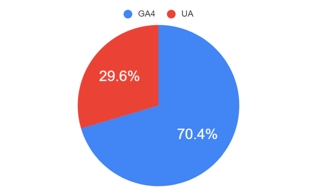 以下は、フルスピードがウェブマーケティング支援を実施しているウェブサイトのGA4導入率を集計したものです。70.4%というのは過去調査してきました業界別導入率調査に比較すると高い水準です。※以下表とグラフにおけるUAとは、GA4以前のバージョンであるユニバーサルアナリティクスを表しています。