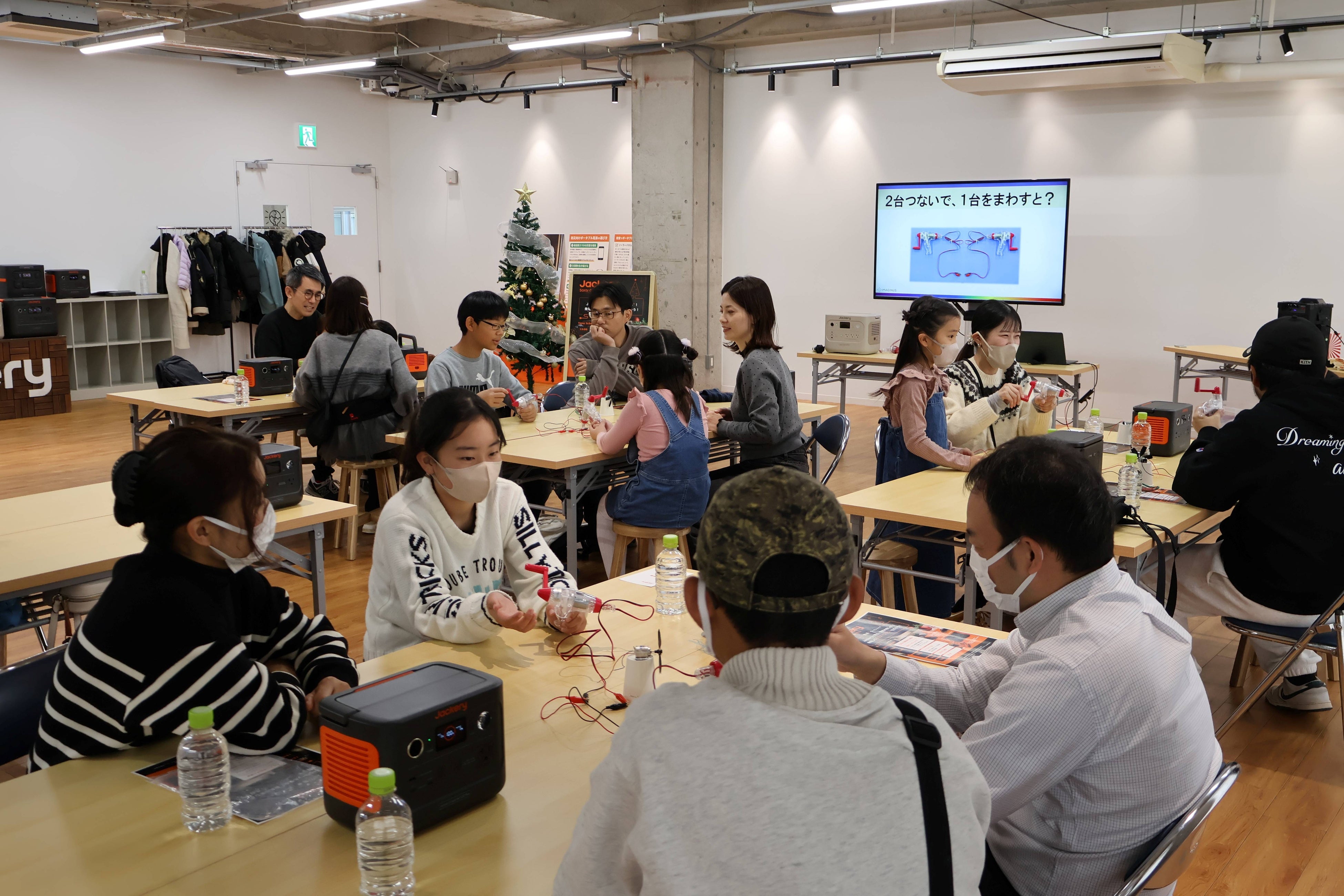 本イベントは、“電育”をテーマに、電気がどのように作られるのか、電気を作るためにはどのくらいのパワーが必要なのか、といったことを楽しく学びながら、便利に電気を使えるポータブル電源によるクリスマスツリーの点灯。そして最後に軽食パーティーと豪華賞品がもらえるビンゴ大会など、さまざまなプログラムを実施しました。