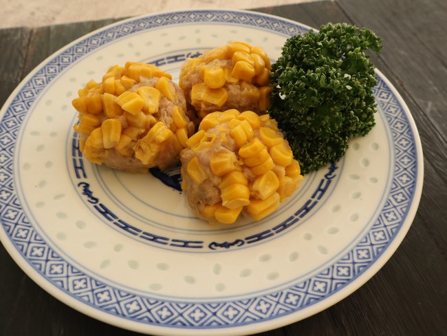 焼売の川の代わりにとうもろこしをまわりに貼り付けてジューシーな焼売に仕上げます。焼売の中にもキヌガサタケを入れます。