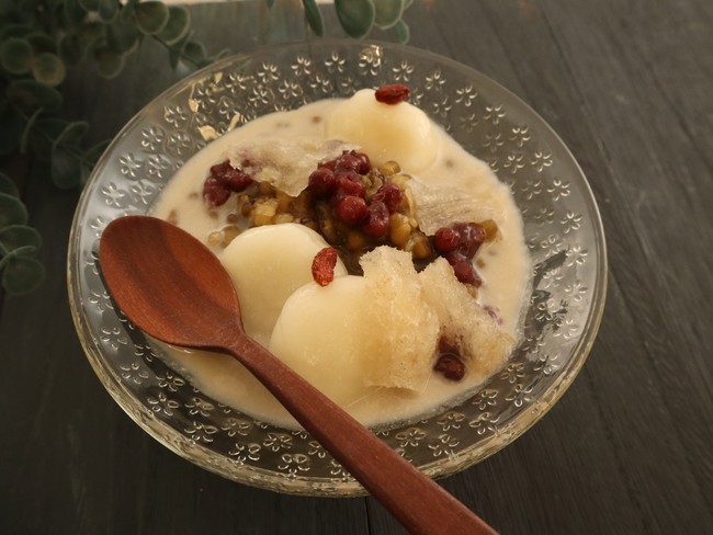 シロップで甘く仕上げたキヌガサタケや緑豆、白玉などを加えて美味しいお汁粉に仕上げます。