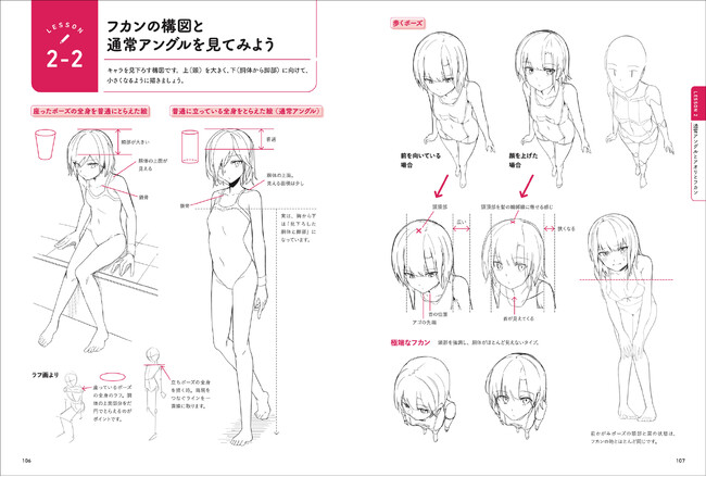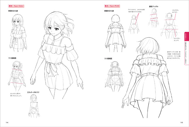 同じニーショットでも、フカンやアオリなどのアングルで見え方が全く違います。その違いを同じイラストで解説するなど、基本から実用テクニックまで実例満載! ラフや下絵などの作画途中のイラストも多く紹介しているので実践に役立ちます。