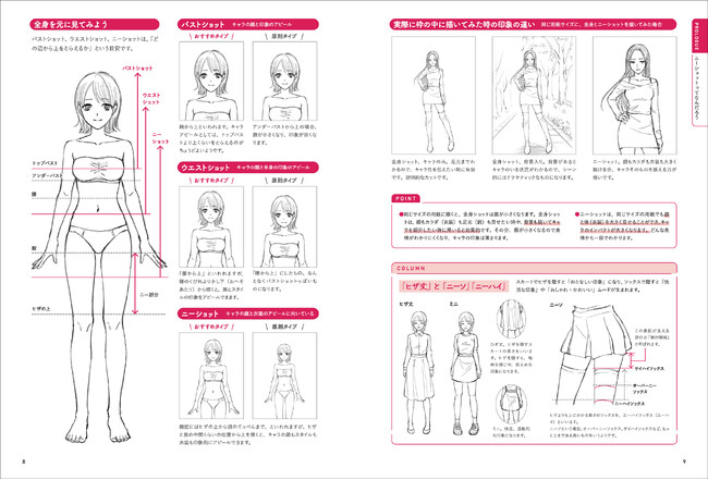 イラストもキャラ絵も、どんなものでも「枠」があります。限られた枠のなかで、めいっぱい顔とカラダをアピールするのに、ヒザから上を描くニーショットは最適。本書では、何をアピールしたいかによって使い分けたい「ショット」の基本から解説。 全身・バスト・ウエスト・ニーショットの基本とコツ、違いの解説も充実しています。