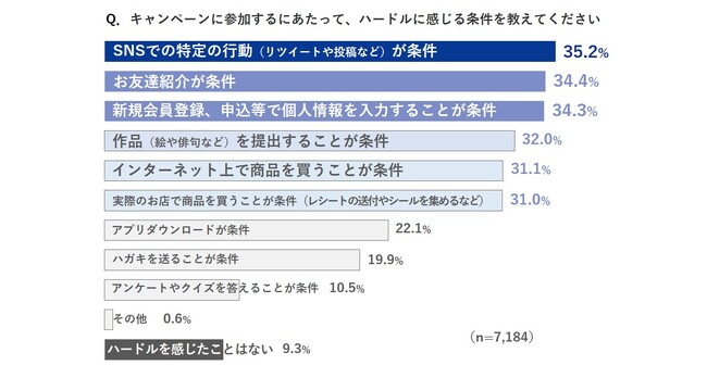 キャンペーンに参加するにあたってハードルに感じる条件を聞いたところ、トップは「SNSでの特定の行動(リツイートや投稿など)が条件」(35.2%)でした。2位以下にはサービスや商品を友人・知人に紹介することで特典が受けられる「お友達紹介が条件」(34.4%)、3位には「新規会員登録、申込等で個人情報を入力することが条件」(34.3%)が続きます。