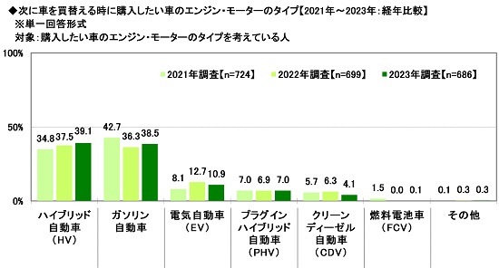 過去の調査結果と比較すると、「ハイブリッド自動車(HV)」は2021年34.8%、2022年37.5%、2023年39.1%と2年連続で上昇しました。近年ハイブリッドシステムを採用する車種が増え、ハイブリット自動車の燃費の良さなどに魅力を感じる方にとって、選択の幅が広がっているのではないでしょうか。