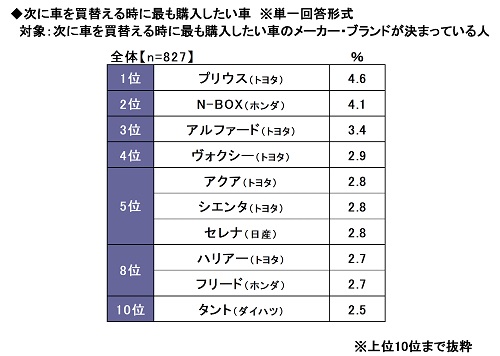 最も購入したいと思う車(車種)を聞いたところ、1位「プリウス(トヨタ)」(4.6%)、2位「N-BOX(ホンダ)」(4.1%)、3位「アルファード(トヨタ)」(3.4%)、4位「ヴォクシー(トヨタ)」(2.9%)、5位「アクア(トヨタ)」「シエンタ(トヨタ)」「セレナ(日産)」(いずれも2.8%)となりました。(※6)。