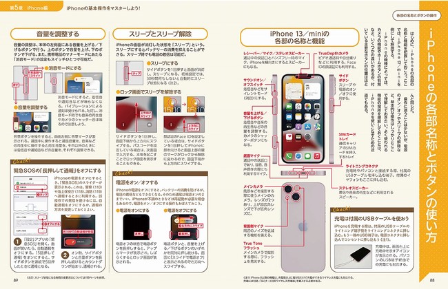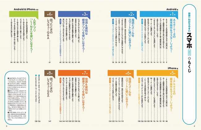 本書は、Android とiPhoneの両OSに対応。それぞれのOSで、電話やメールといった基本機能から、ネットやテレビ電話、地図、カメラ、ビデオ電話などの便利な最新機能までをわかりやすく解説しています。