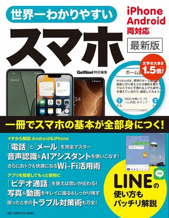 「世界一わかりやすいスマホ 最新版」は、PCムックシリーズ売上No.1の「500円でわかる」シリーズから派生した、A4ワイドの大判と読みやすい大きな文字が特徴のスマホ入門書です。本書は、前半はAndroidを、後半ではiPhoneを解説する構成となっています。電話やメールといった基本機能に加え、ビデオ電話や地図アプリ、写真・動画アプリなどの使いこなしまでしっかり紹介。LINEの使い方もマスターできます。