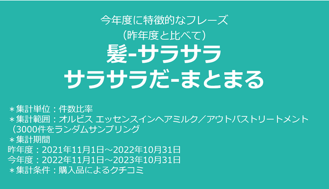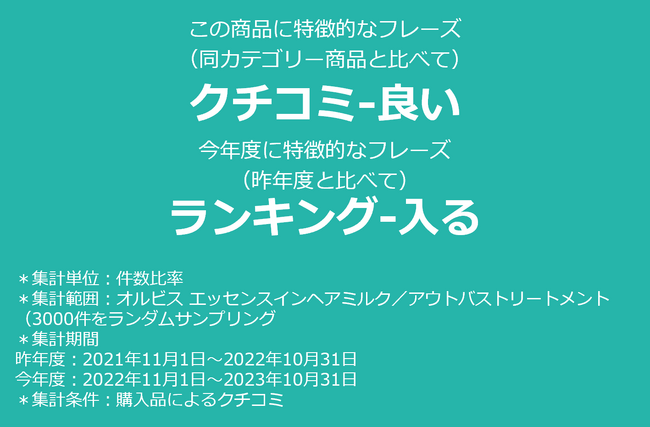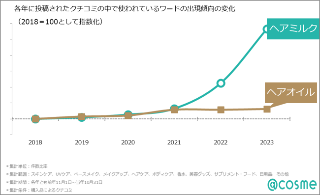 また、クチコミ全体では、「ヘアミルク」というワードの出現率が、昨年と比較して2.1倍に伸びています。「出現数」ではまだまだ「ヘアオイル」というワードの方がボリュームが大きいものの、出現率はここ数年横ばいであることから、ヘアミルクの急速な認知・ニーズの拡大を感じさせられます。