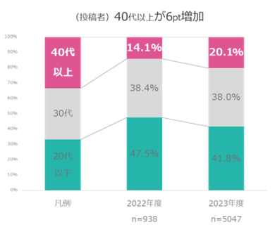 本商品のクチコミ投稿者の年齢分布をみてみると、昨年より40代以上が6ポイント増加しており、使用者の裾野の広がりがみられます。SNSというフィールドを飛び越えたことで、情報収集感度の高い若年層だけでなく、大人世代にも人気が広がり、使用年齢層の拡大へと繋がったようです。
