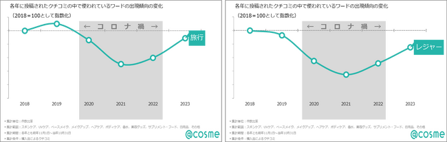 ベストコスメアワード集計対象期間中のクチコミでも、コロナ禍では大きく減少していた「旅行」「レジャー」というワードの出現率が戻りつつあり、昨年と比較すると1.5倍に増加しています。