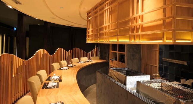 同業態は、グエンティタップ店の1階カウンター席で運営いたします。波型の格子で区切られた同カウンター席は、高級寿司店のような温もりのある木のカウンターがお客様を出迎え、静かに流れてくるジャズに耳を傾けるなど、デートやお祝い、ビジネスでの接待にふさわしい空間となっています。