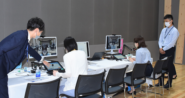 また、調査研究中の「遠隔窓口支援システム」では、来場者が住民役と職員役に分かれて、遠く離れた出先機関にいる申請者と本庁窓口にいる職員をつないだ〈対面による申請手続き〉を疑似体験していただきました。